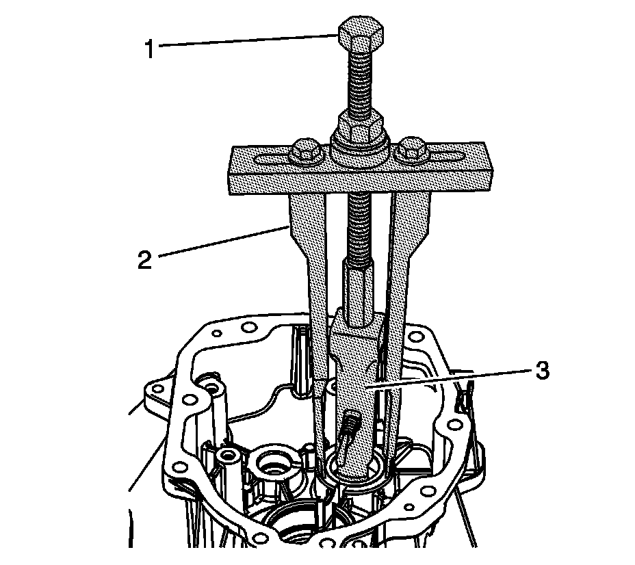 7. Install J 45124-1 - removal bridge (1), J 45124-9 - puller leg (2), and J 29369-2 - remover (3) in the race from the countershaft bearing assembly in the extension housing.