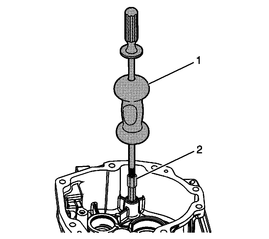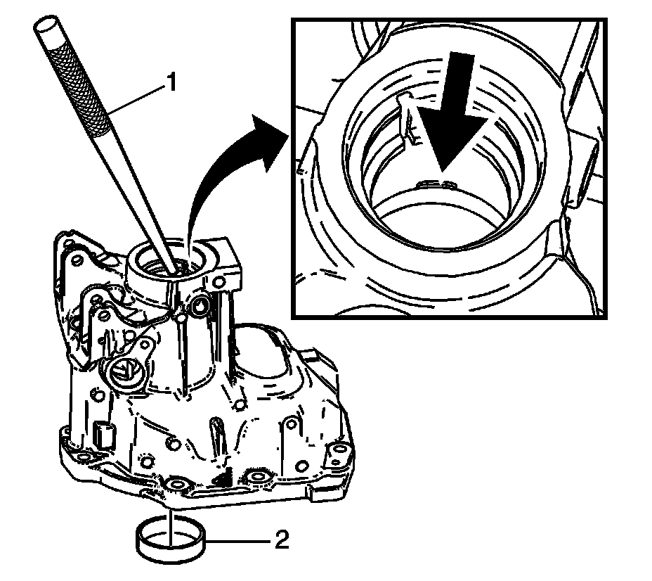 18. Insert a brass drift (1) through the mainshaft opening of the extension housing, into the oil clearance gap. Using a mallet, tap down on the drift to remove the mainshaft bearing race (2).