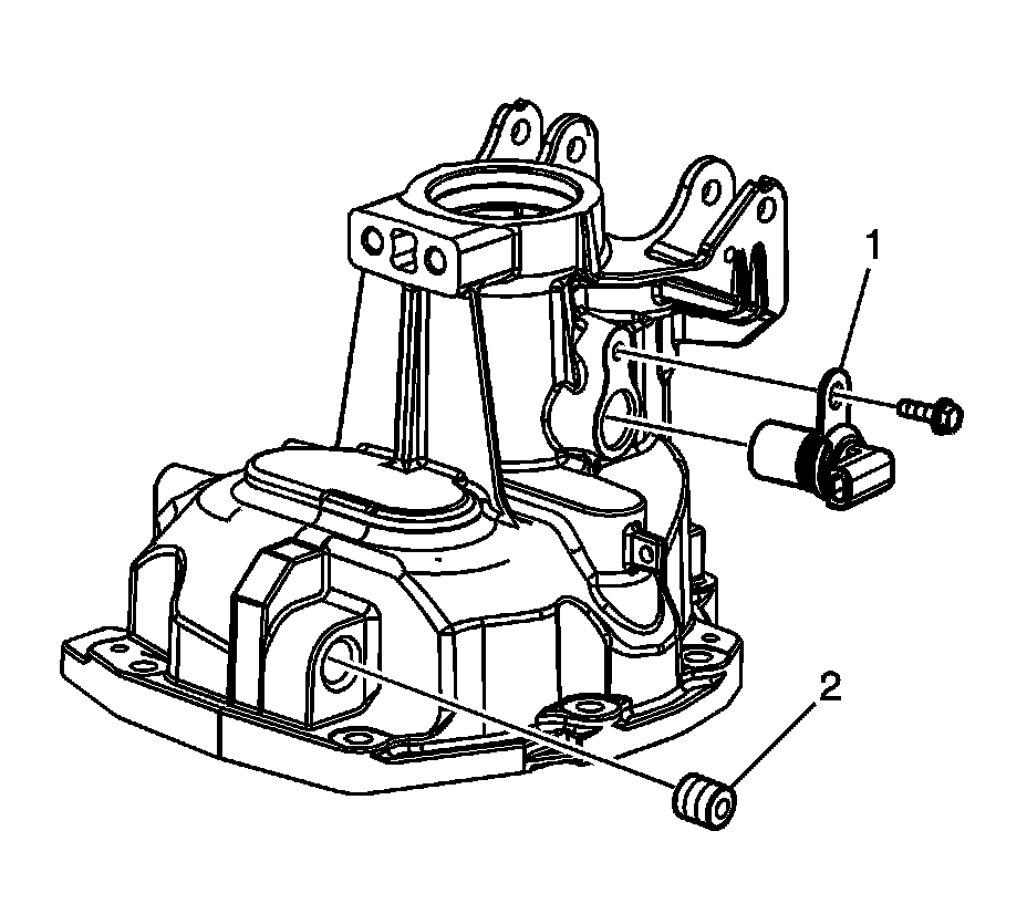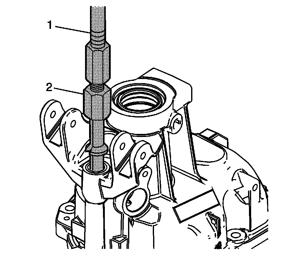 19. Remove the reverse rail bushing using the J 36190 - handle (1) and J 39439-2 - installer (2).