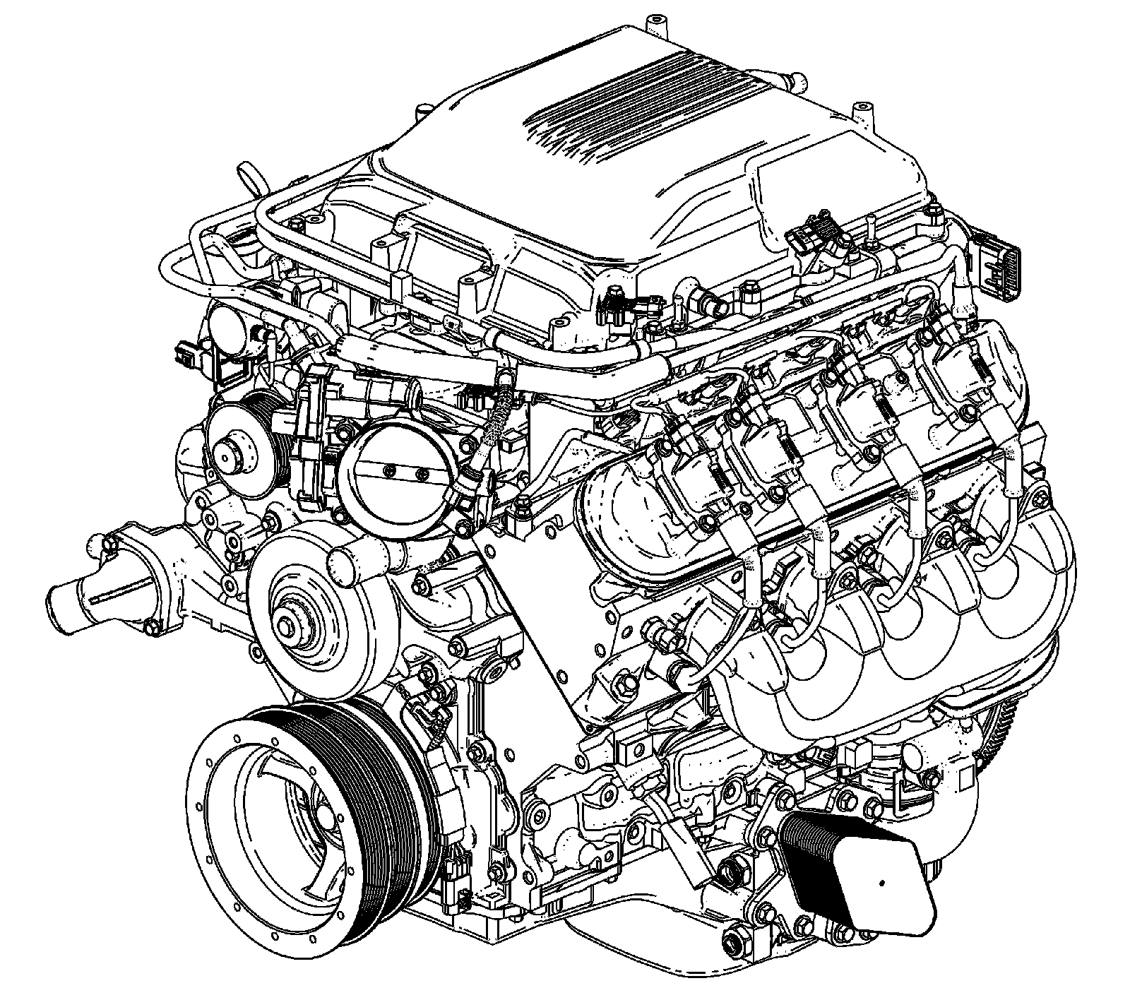 The engine block is a cam-in-block deep skirt 90 degree V configuration with 5 forged steel crankshaft bearing caps. The engine block is cast aluminum with press-in-place cast iron cylinder liners. The 5 crankshaft bearing caps each have 4 vertical M10 and 2 horizontal M8 mounting bolts. The camshaft is supported by 5 press-in-place camshaft bearings. Eight piston cooling oil nozzle assemblies are mounted between each of the opposing cylinders. The oil nozzles spray oil up the cylinder bore directing oil to the bottom of the pistons. The left bank of cylinders are number 1-3-5-7 (#1 is front left) and the right bank of cylinders are 2-4-6-8 (#2 is front right) viewed from the flywheel end of the engine. The engine firing order is 1-8-7-2-6-5-4-3.