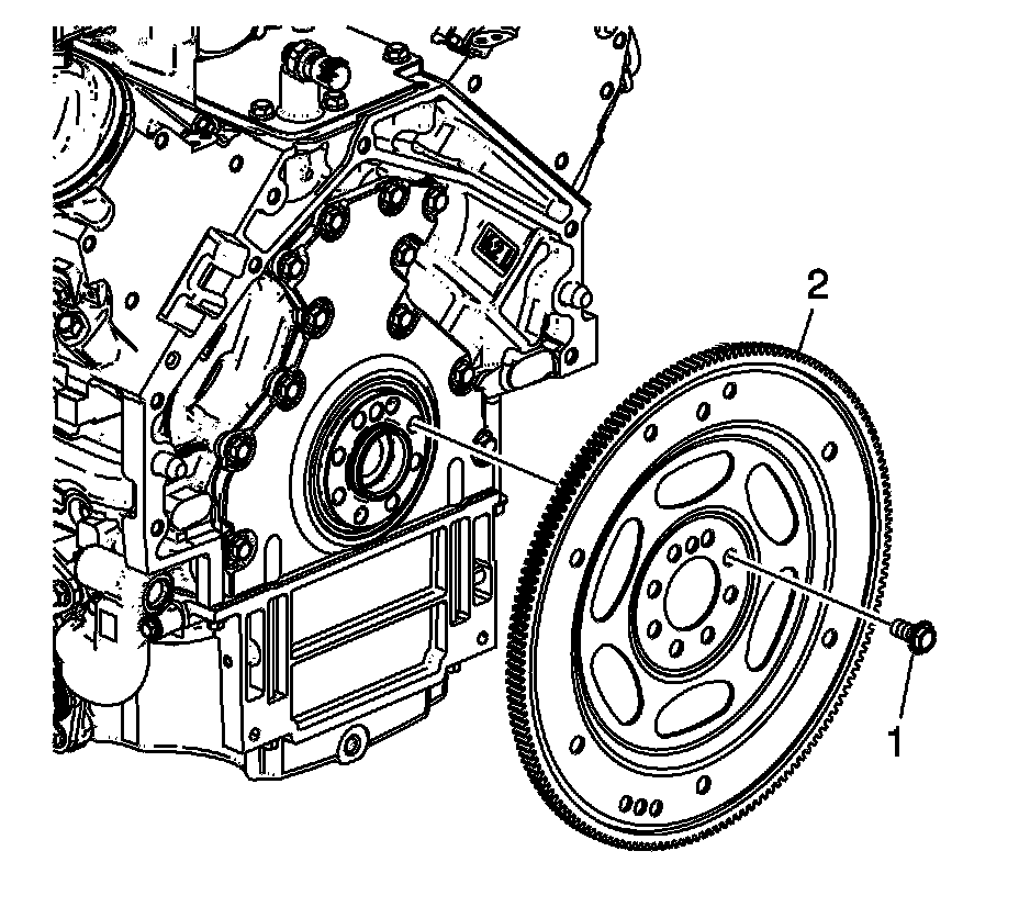 3. Apply threadlock GM P/N 12345382 (Canadian P/N 10953489), or equivalent, to the threads of the flywheel bolts (1).