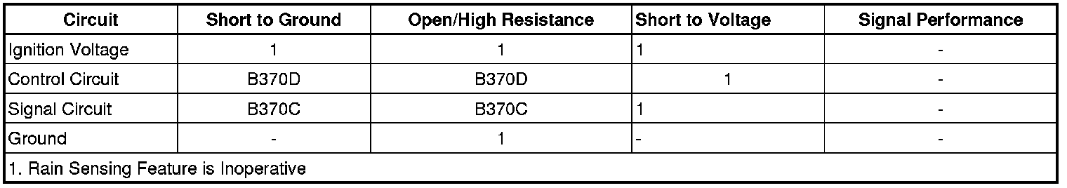 The outside moisture sensor uses the moisture sensor signal 2 circuit to command wiper motor wipe cycles and to confirm the moisture sensor signal 1 is being received. If at anytime communication between the outside moisture sensor and BCM is lost, the BCM will use the inputs from the windshield wiper/washer switch in the delay positions to operate the wiper motor at continuous variable delay intervals.