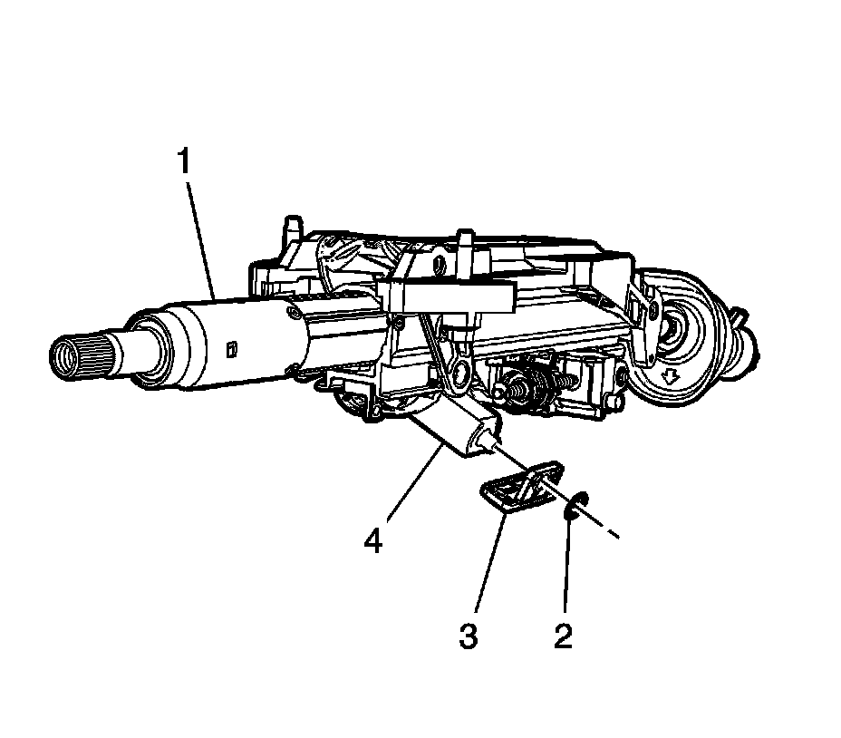 1. If you are installing a NEW steering column assembly (1) or a steering column with a NEW steering column tilt wheel actuator motor (4), use a flat blade pry tool in order to GENTLY remove the star washer (2) and the plastic bracket (3) from the tilt wheel actuator motor.