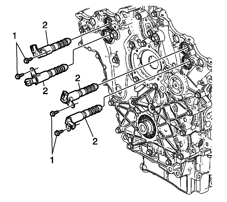 8. Place the camshaft position actuator valves (2) in position on the front cover.