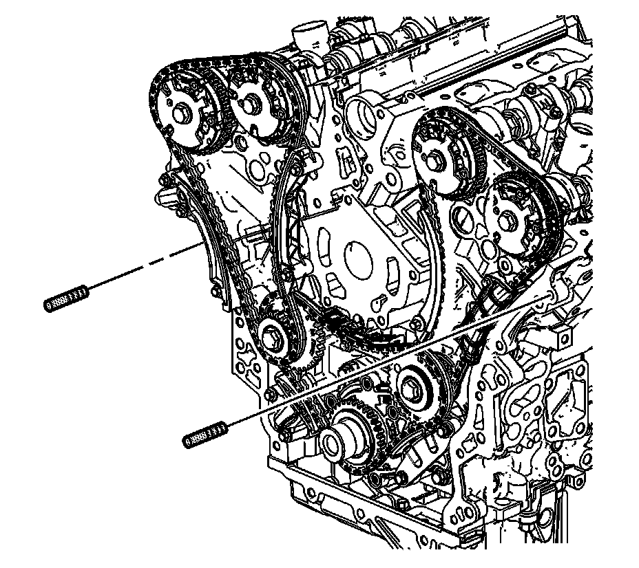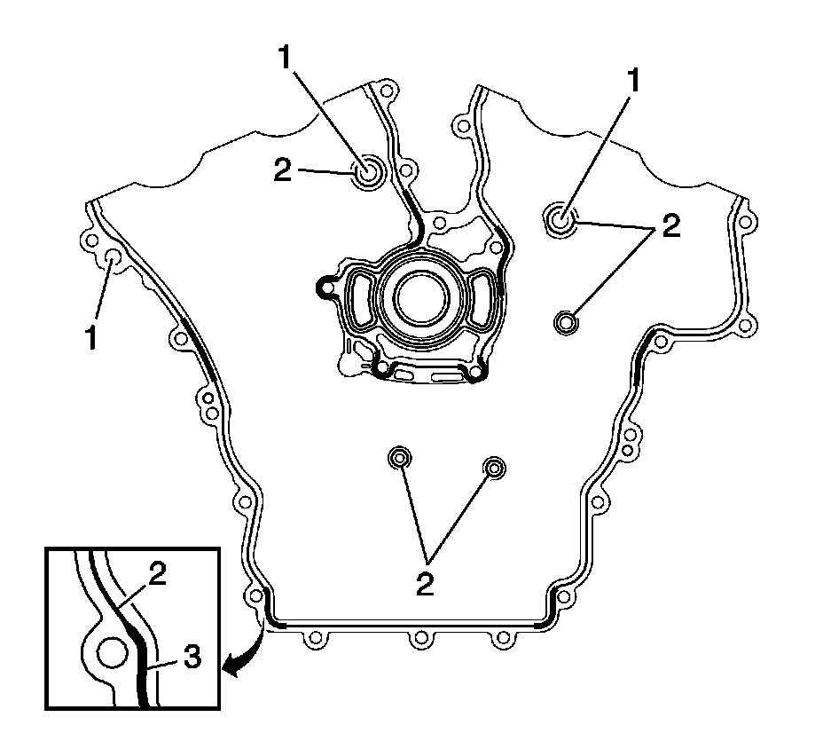 3. Apply a 3 mm (0.118 in) bead of RTV sealant on the engine front cover as shown (2). Apply a 5 mm (0.197 in) bead of RTV sealant on the engine front cover as shown (3). Refer to Adhesives, Fluids, Lubricants, and Sealers Adhesives, Fluids, Lubricants, and Sealers for recommended sealant.