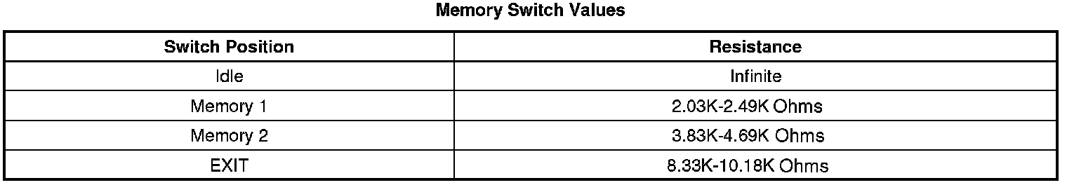 Reference voltage is supplied to the memory switch from the driver door module (DDM). When a memory switch is pressed, battery voltage is applied through the switch contacts, a series of resistors and thorough the memory switch signal circuit to the DDM. The door module then sends a serial data message to the memory seat module (MSM) indicating the memory recall request. The MSM then commands the appropriate seat motors to move to the pre-recorded seat positions stored in memory in response to the switch input.