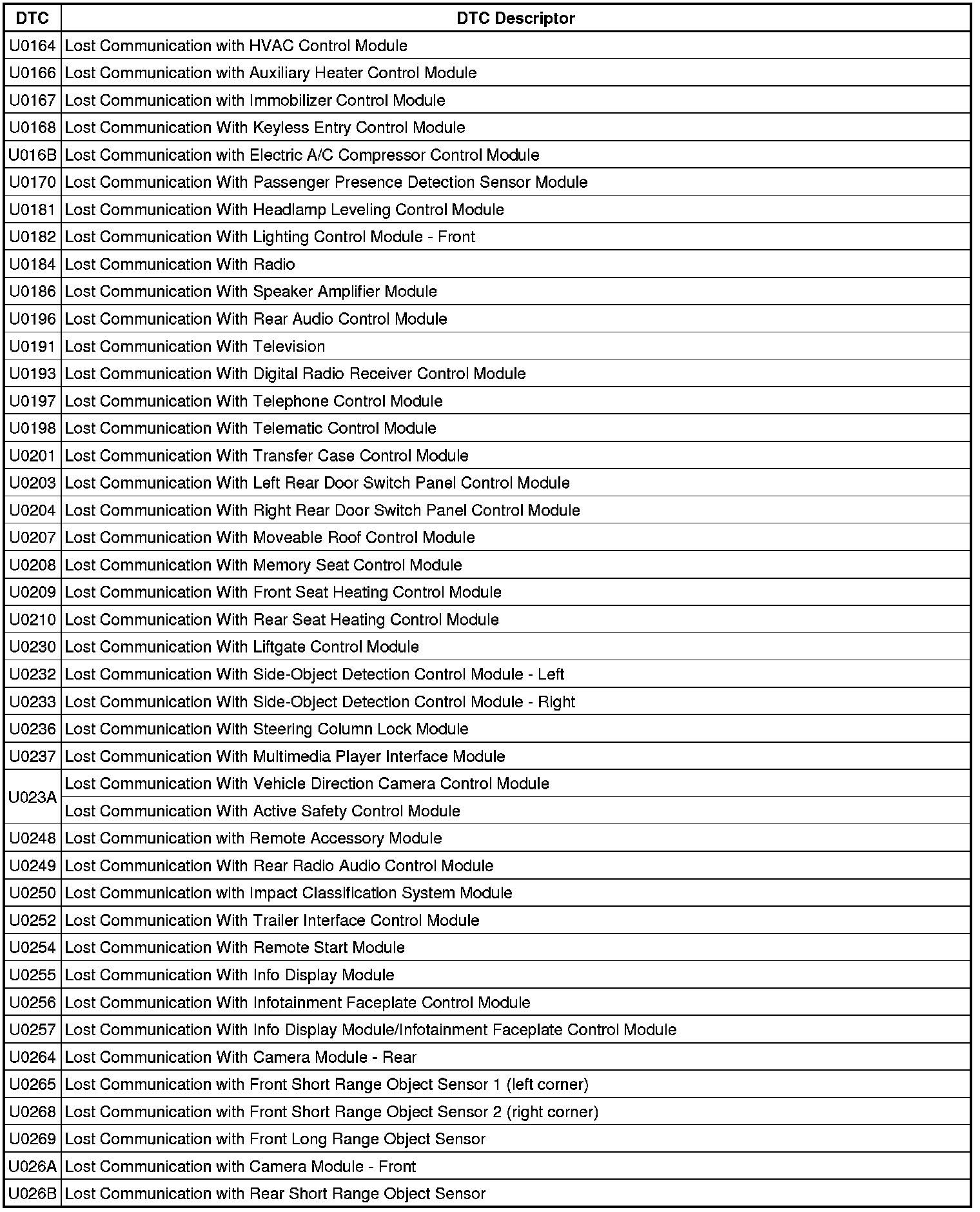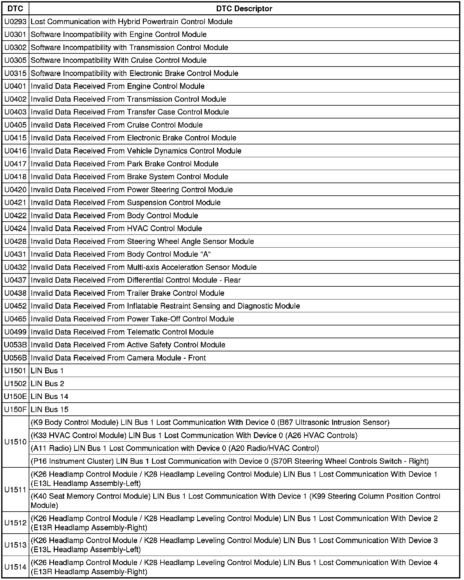 This list includes all Data Communications related U-code DTCs in alphanumeric order with descriptors for all devices. Not all DTCs listed will be applicable to all vehicles.