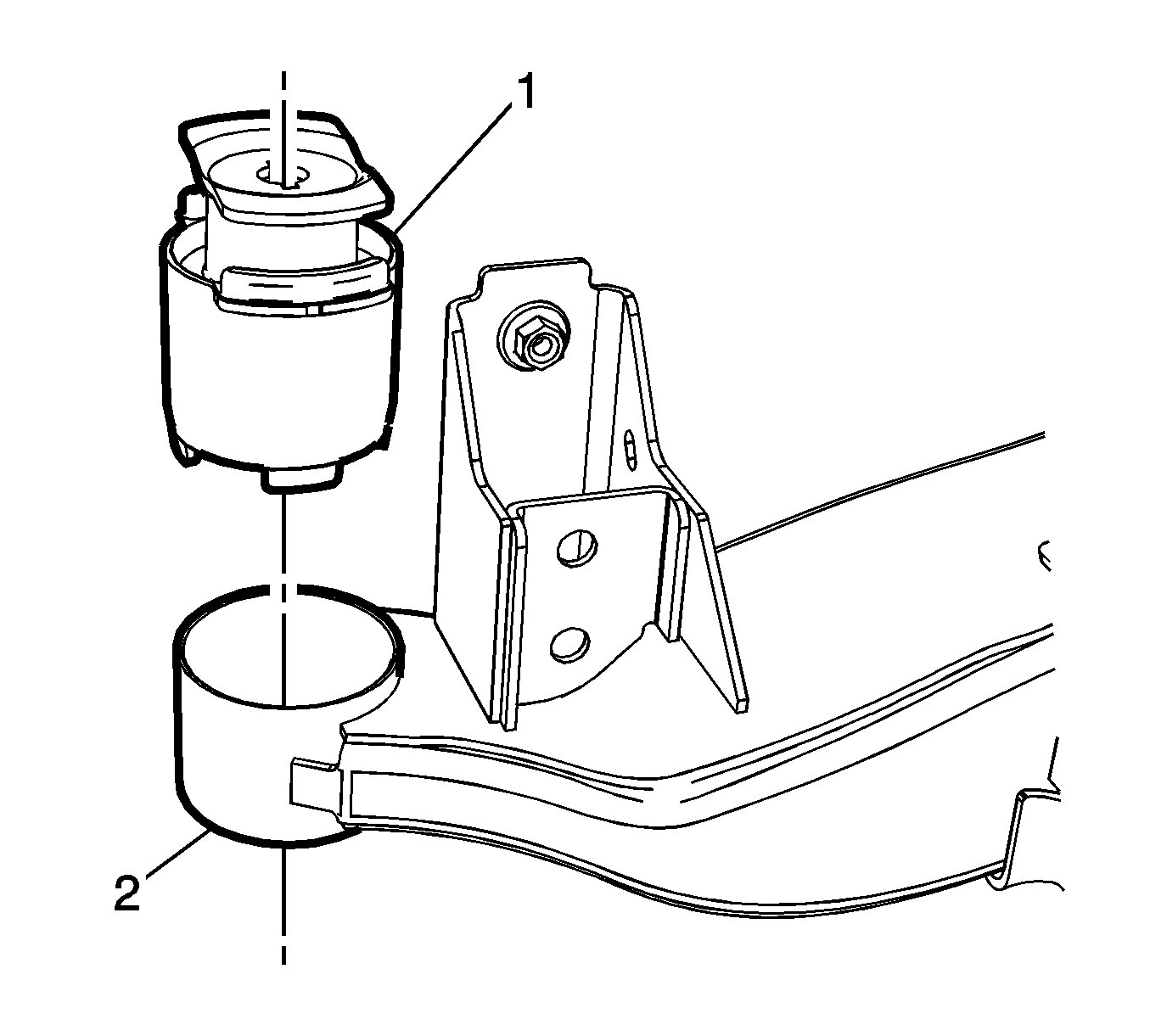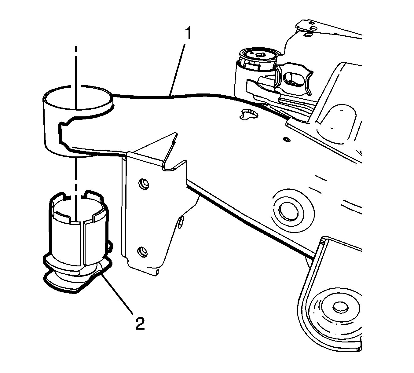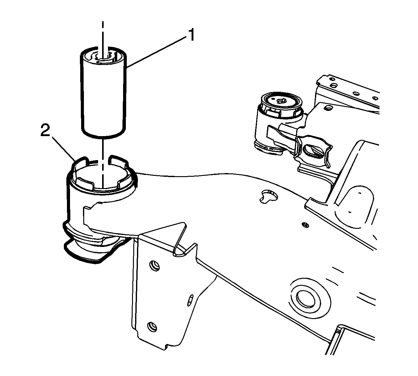 1.Position the rear suspension support bushing (1) in the rear suspension support (2).