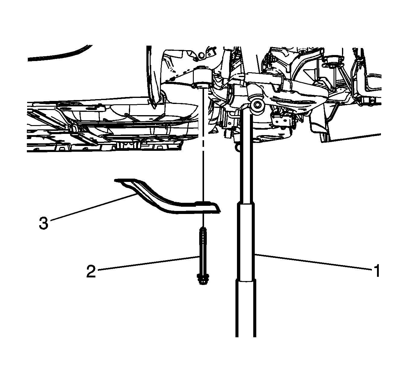 14.Install the rear suspension support front reinforcement (3) and the rear suspension support bolts (2).