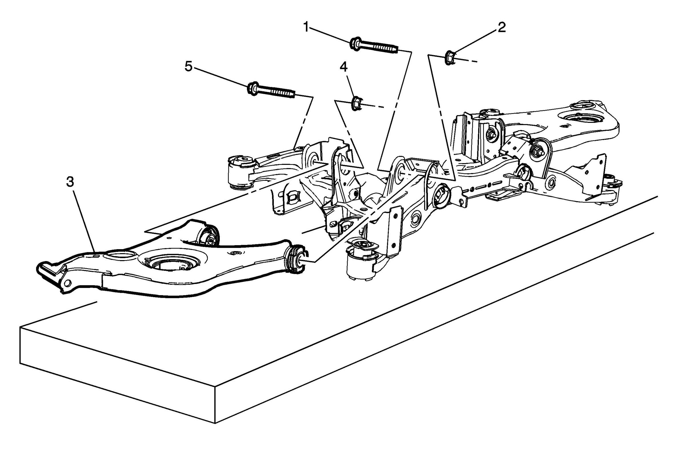 27.Remove the rear suspension lower control arm rear bolt (5).