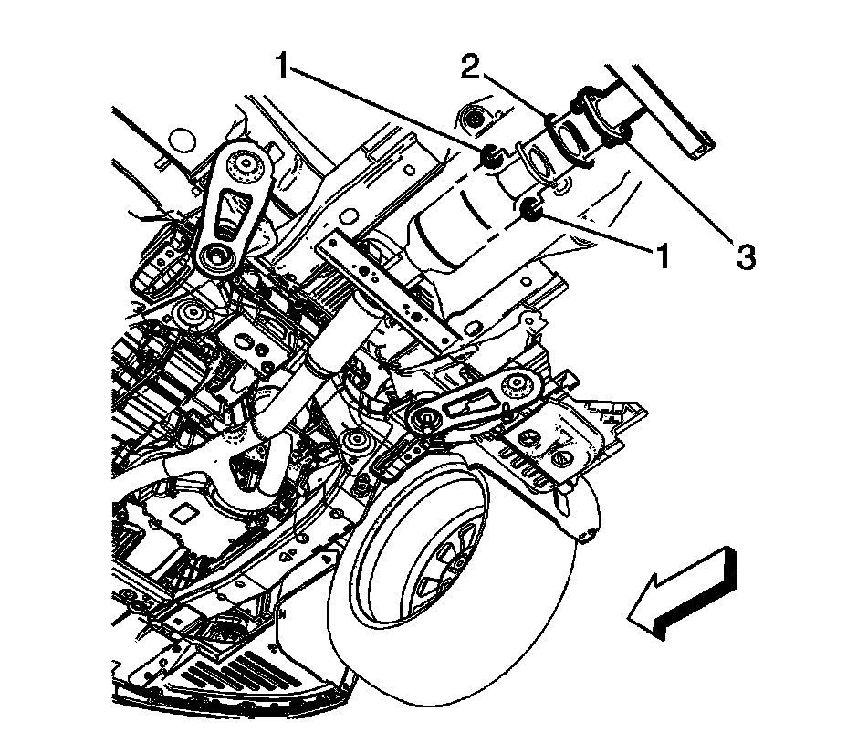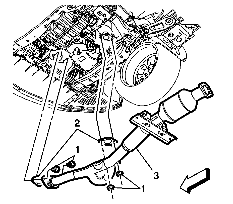 10. Remove the exhaust front pipe fasteners (1) and lower the exhaust front pipe (3) to the floor.