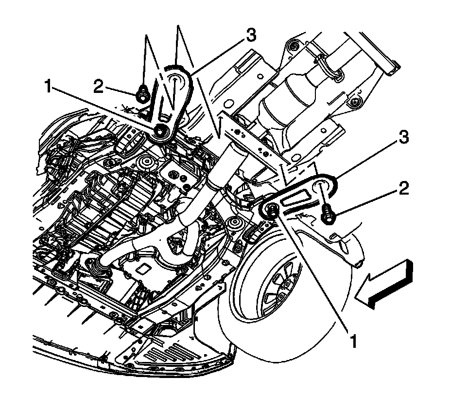 1. Install the exhaust front pipe into place and rotate the drivetrain and front suspension supports (3) over the exhaust front hanger bracket.