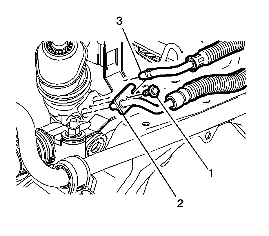 21. Remove the power steering gear inlet and outlet hose bolt (1) and disconnect the power steering gear inlet hose (2) and power steering gear outlet hose (3) from the steering gear.