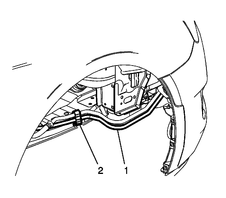 8. Secure the power steering gear outlet hose (1) in the plastic clip (2).