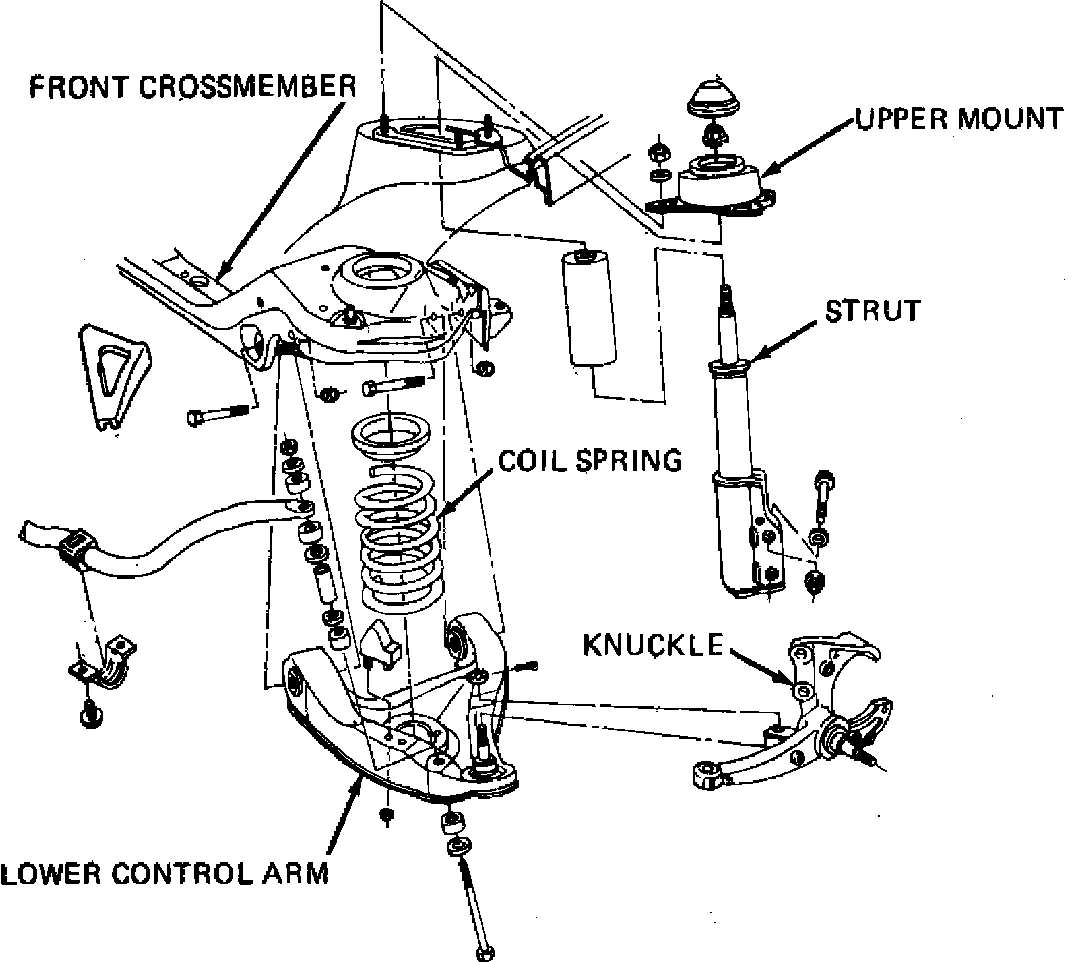 A modified strut type suspension is used on Camaro, Fig. 2. Each wheel is independently connected to the chassis by a lower control arm, spindle and a strut assembly which locates the spindle and controls ride by dampening spring action. Coil springs are mounted between the lower control arm and crossmember, and a stabilizer shaft is connected between the chassis and control arms to control side roll.