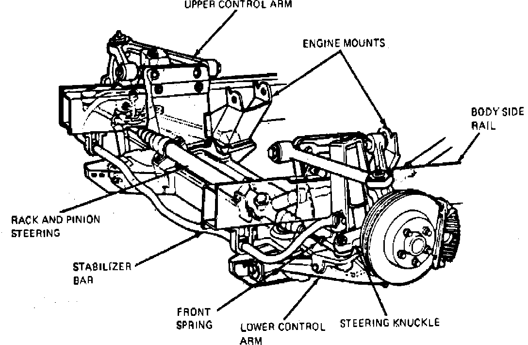 The front suspension used on 1984---88 Corvette consists of forged aluminum upper and lower control arms and steering knuckle, a fiberglass mono-leaf spring, shock absorbers and stabilizer bar, Fig. 3. The front spring is transverse mounted on the crossmember and bears against lower control arms. The stabilizer bar and shock absorbers are connected between the chassis and lower control arms, and control side roll and dampen spring action respectively. Upper and lower control arms are connected through the knuckle, which is specially designed to move the wheel center line rearward of the conventional ball joint center line.
