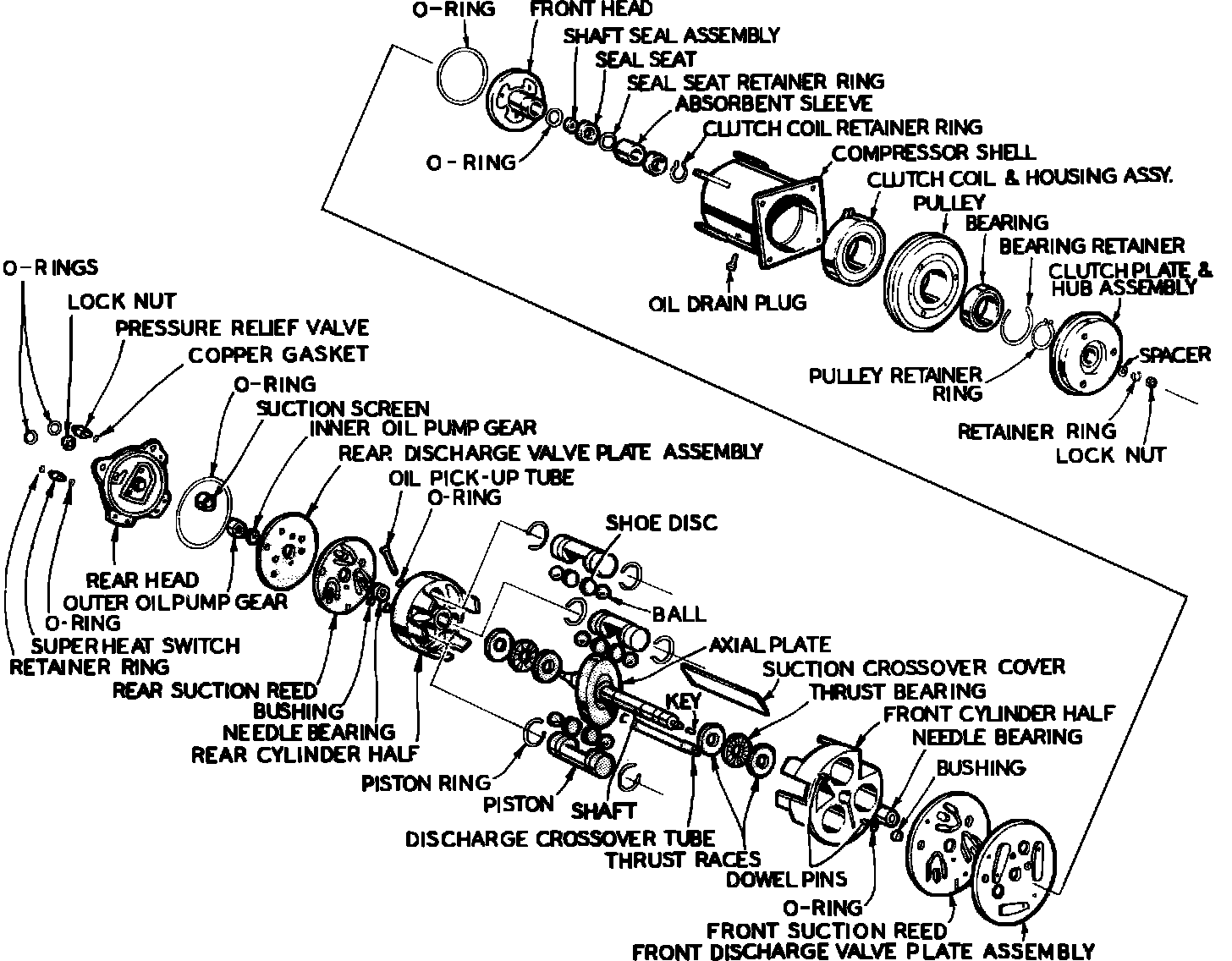 Some service operations can be performed without disturbing internal mechanism or completely removing compressor from car. Among them are replacement of clutch plate and hub assembly, pulley and bearing assembly, and pulley bearing.