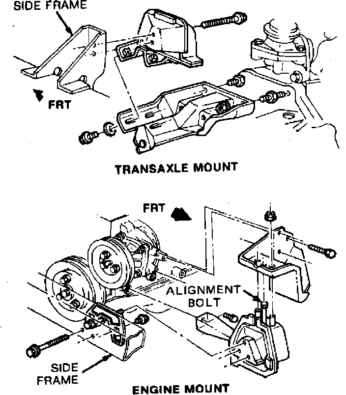 39. Reverse removal procedure to install. On 1982---83 models, once engine is installed, check alignment bolt. If excessive effort is required to remove bolt, loosen transaxle mount adjusting bolts and realign power train.
