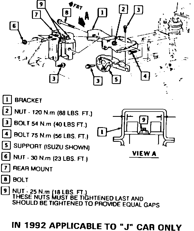 C. Block vehicle wheels and apply park and service brakes. With an assistant watching the engine, make sure the transmission mount is not grounded against the stop in drive. If so, shift the mount until the rubber stop is not contacting the mount with the engine in drive. Refer to Figure 2. (1992 "J" car only).