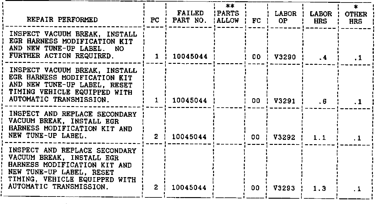 To correct this condition, please contact your Chevrolet Dealer to arrange a service date to install an EGR harness modification kit including a new tune-up label. In addition, the carburetor secondary vacuum break will be inspected. When required, secondary vacuum breaks found to be inoperative, will be replaced. This service will be performed for you at no charge.