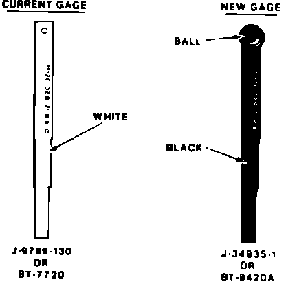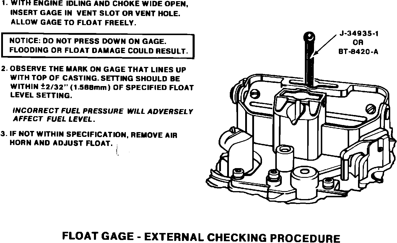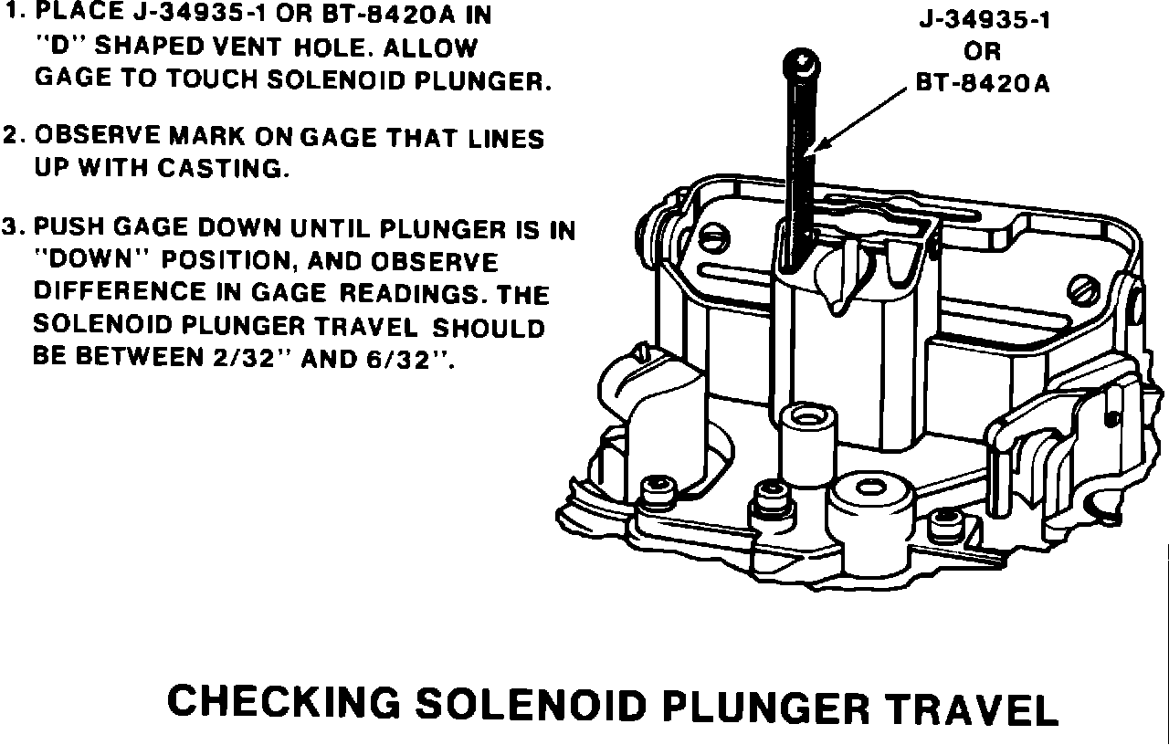 The new gauge, P/N J-34935-1 or BT-8420A, reflects the design variables of the past several years that may have led to occasional inconsistent readings when the older gage was used. The new gage is also suitable for checking the float level of all past model quadrajet and dualjet models, and in checking mixture control solenoid plunger travel.