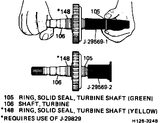 Shown below, the green colored turbine shaft seal rings (105) require the use of installation tool No. J-29569-1 and sizing tool No. J-29569-2. The yellow colored turbine shaft seal ring requires the use of installation tool No. J-29829-1 and sizing tool No. J-29829-2.