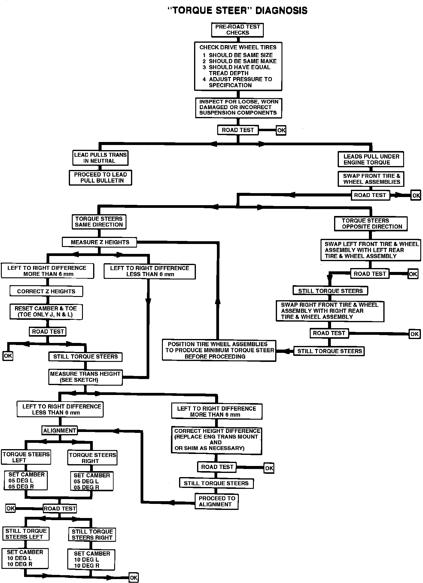 In conjunction with the attached "Torque Steer" Diagnosis Chart, the following possible causes of "Torque Steer" should be evaluated and repaired as necessary: