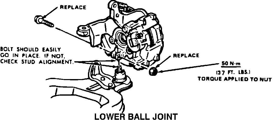Clamp bolt torque is important to the performance of the ball joint stud. To insure proper bolt torque, replace bolt (P/N 14034747) and nut (P/N 11502812), per the shop manual, each time vehicle service requires (separation removal of the ball joint from the knuckle). Clamp torque should be 50 N-m (37 ft. lbs.).