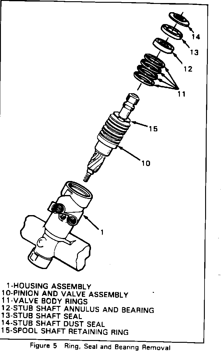 10. Remove stub shaft dust seal, stub shaft seal, stub shaft bearing annulus assembly, pinion and valve assembly, with spool shaft retaining ring, and valve body rings attached.
