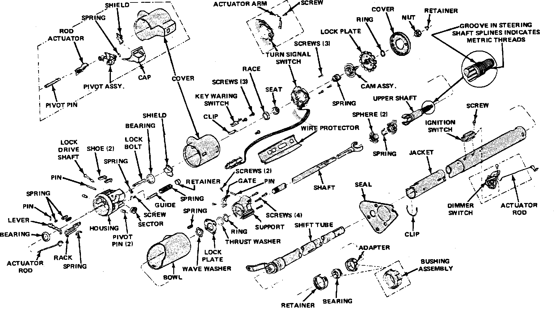 Fig. 22 Tilt steering column exploded view. Models w/column shift less key release: