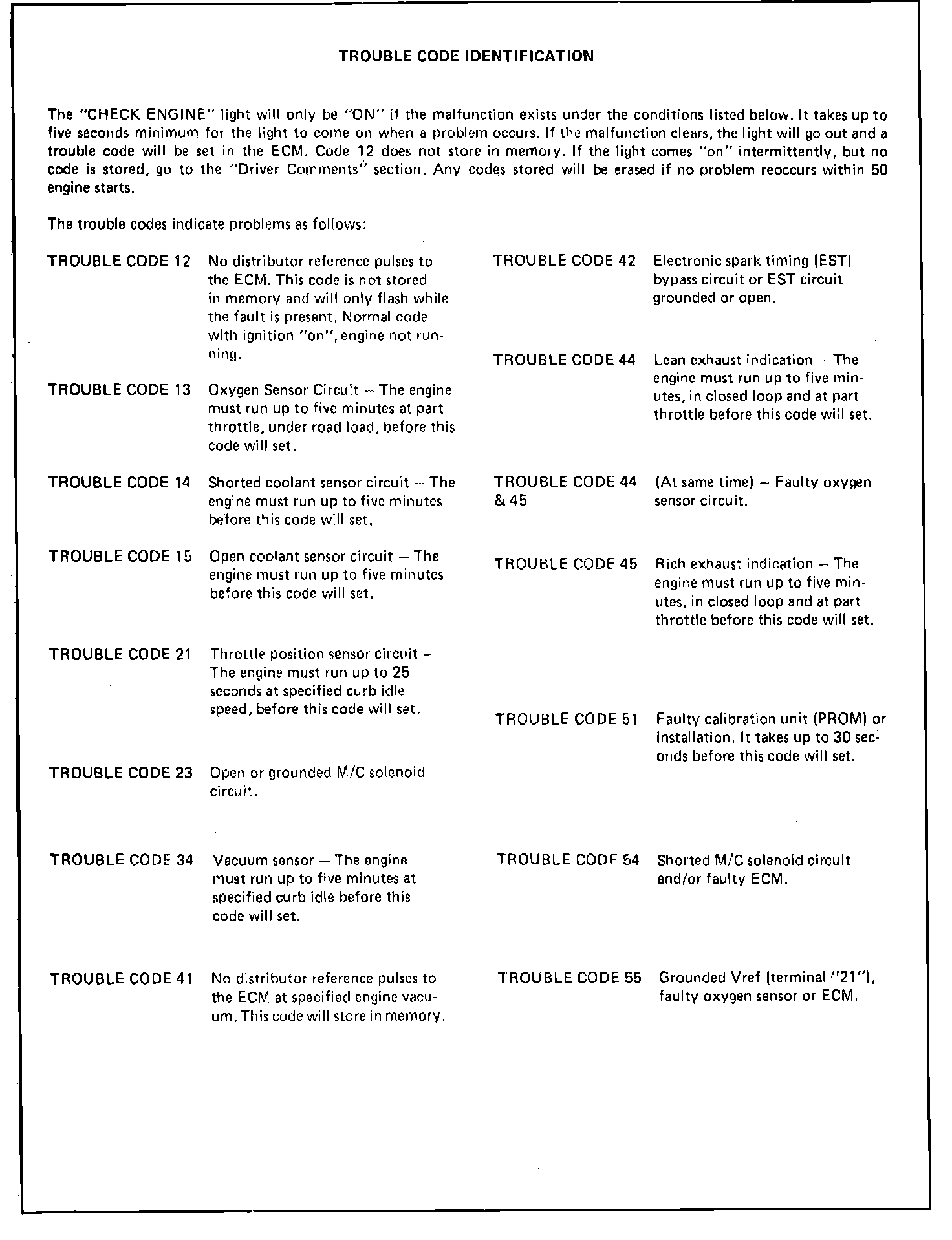 Use the appropriate diagnostic charts if trouble codes 13, 15, 24, 35, 41, 44, 45 and all 50 series codes can be obtained with the ``Check Engine'' lamp off. If any other trouble code is stored and the ``Check Engine'' light remains off, do not use the diagnostic charts for these codes, since the system is operating properly at the time. A System Performance Check and a thorough physical inspection of the circuit involved should be carried out if any of these codes are evident. Repair as necessary.