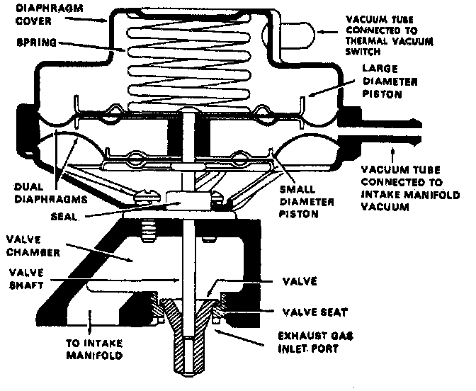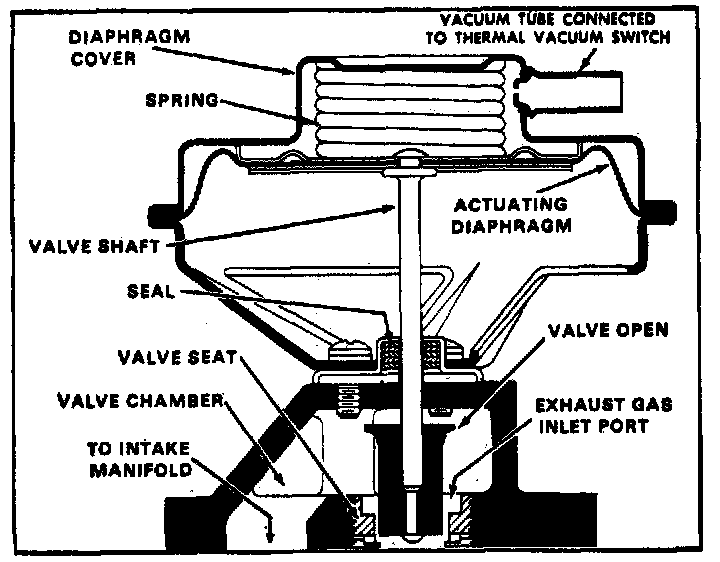 - When ported vacuum reaches approximately 3 in Hg the EGR diaphragm begins to move upward--against spring tension--opening the EGR valve--mounted on the intake manifold--Fig 57--allowing exhaust gas to enter the intake manifold via exhaust crossover channels.