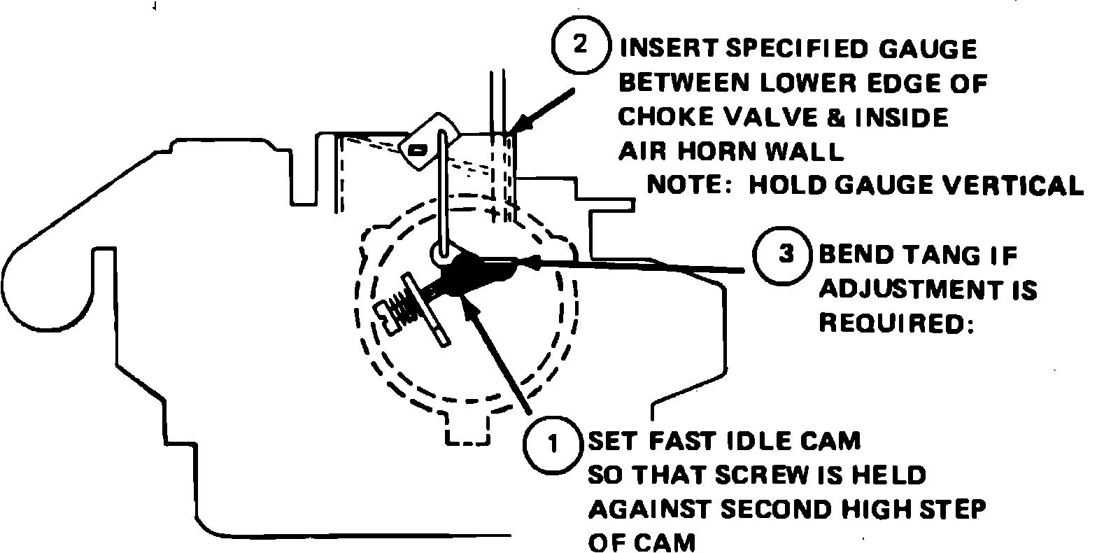 in position so the screw contacts second high step. Insert specified gauge between lower edge of choke valve and air horn wall. Bend tang to adjust.