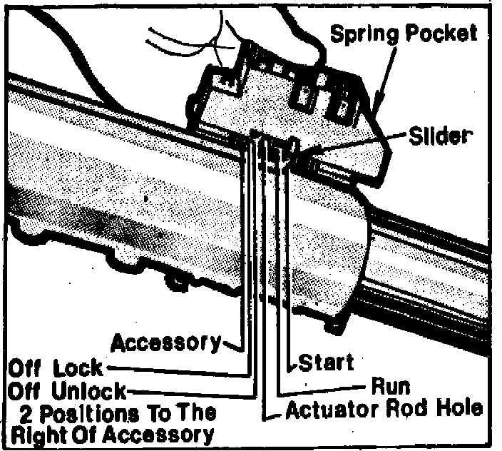 2. Assemble buzzer switch and lock cylinder, then turn lock cylinder clockwise to stop and then counterclockwise to other stop (OFF-UNLOCK) position. Position ignition switch, Fig. 10, then move slider to extreme left (ACC) and slide back two positions to the right to OFF-UNLOCK position. Install actuator rod into slider and install the bottom screw only, to retain the ignition switch. Do not move switch out of detent.