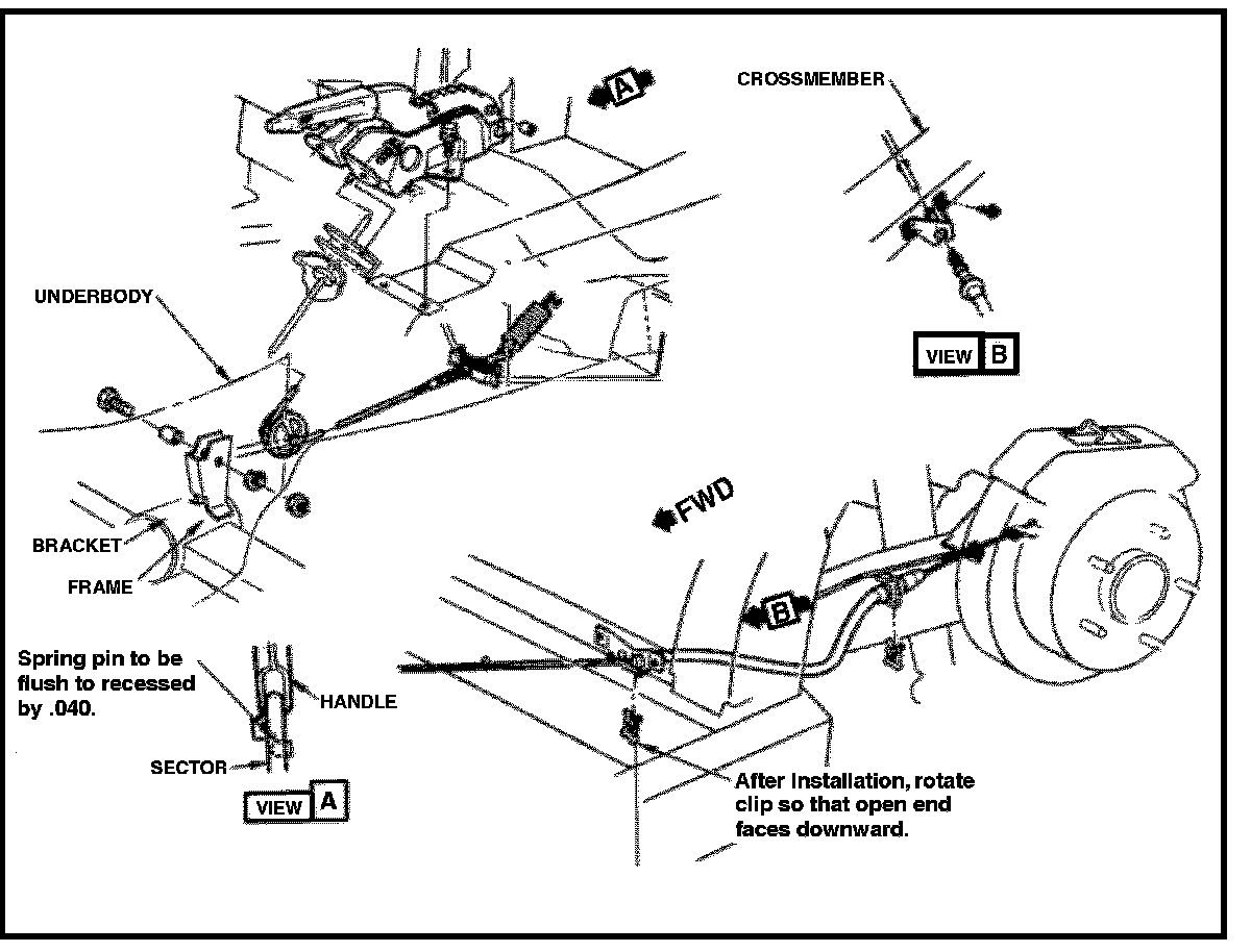 7. Under vehicle, loop front cable around pulley wheel and secure pulley wheel to bracket with bolt, washer and nut.