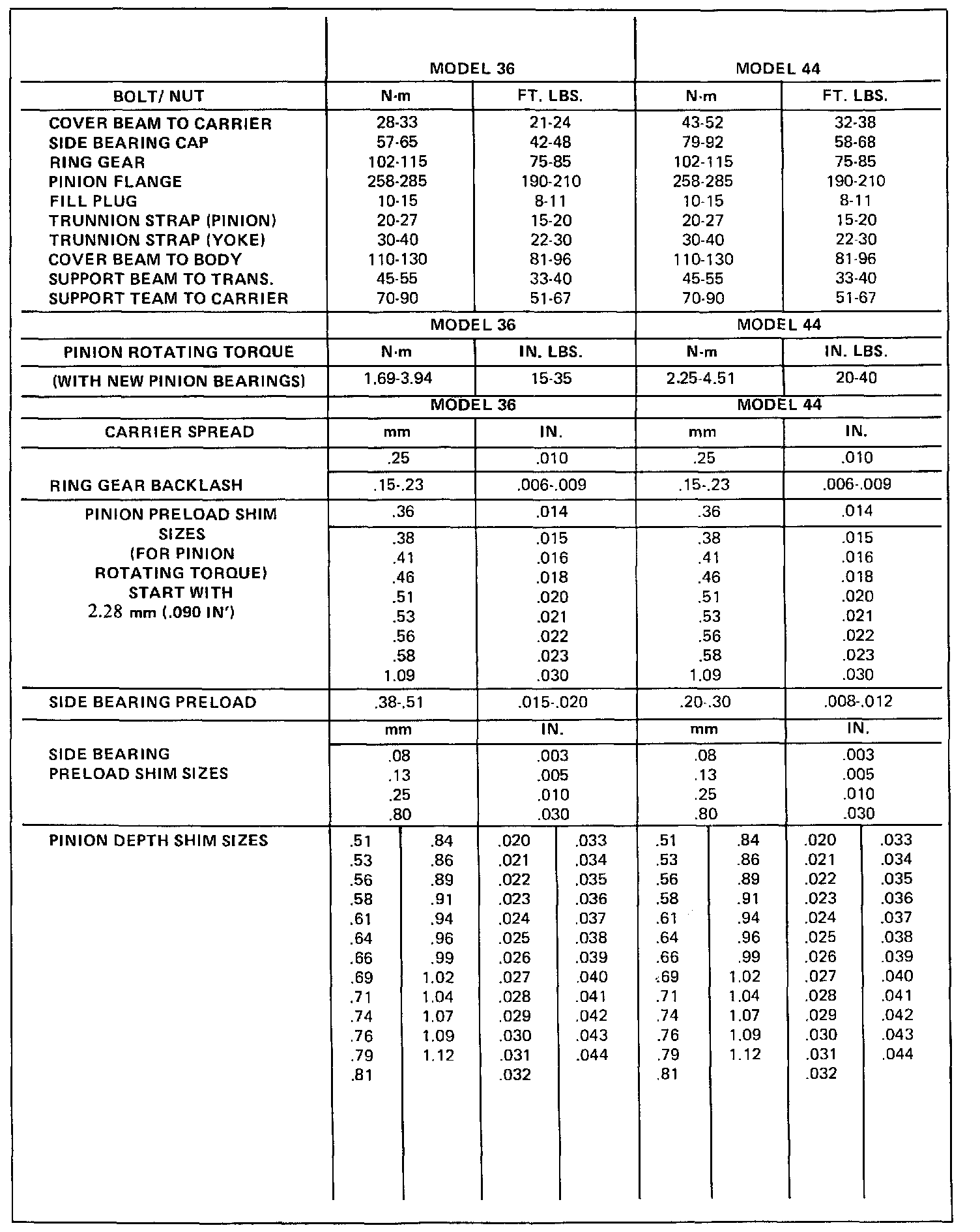DIFFERENTIAL TORQUE SPECIFICATIONS
