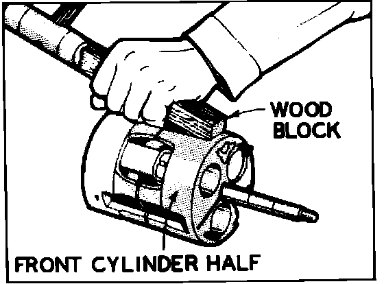 3. Position complete internal mechanism, rear cylinder down, on support block, and remove front cylinder half.