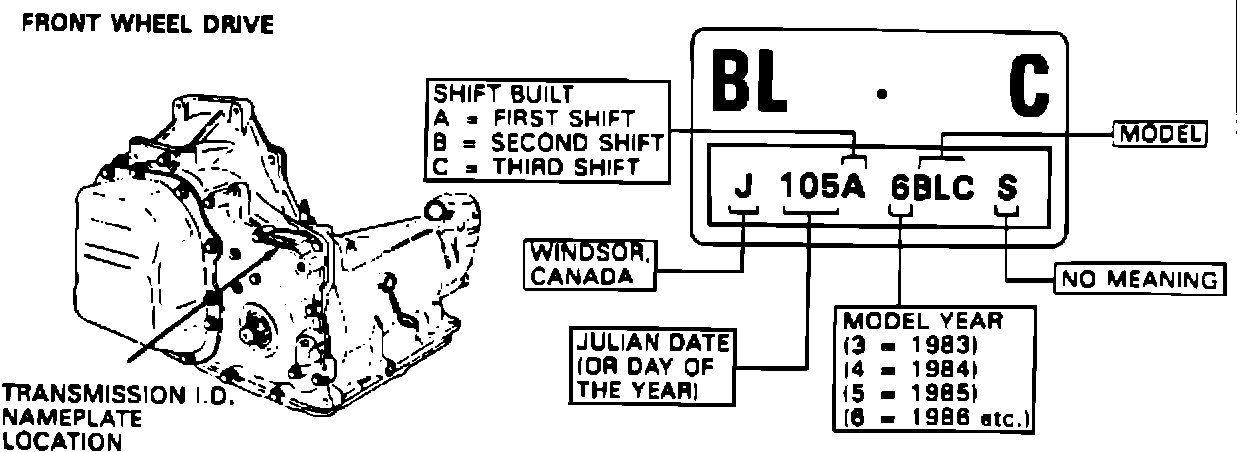 The transmission identification tag or stamped identification contains such information as transmission type, model year, model, serial number, and Julian date.