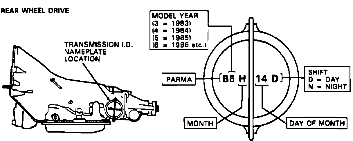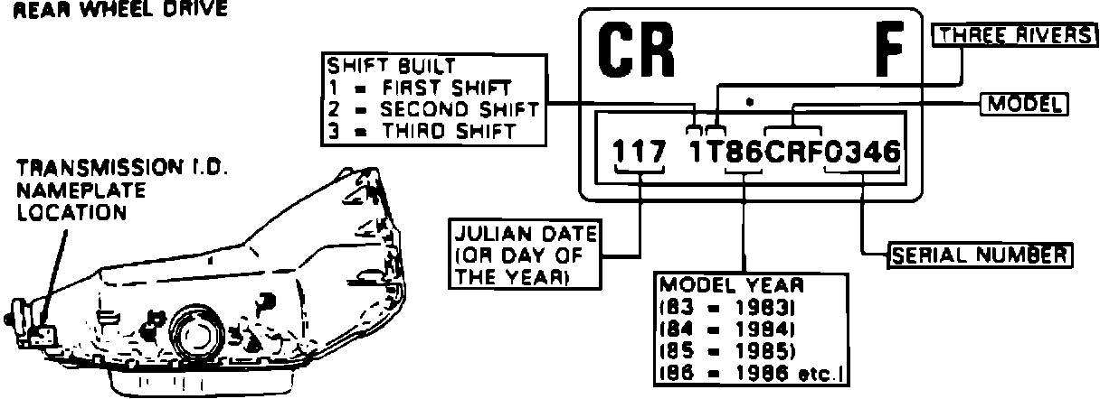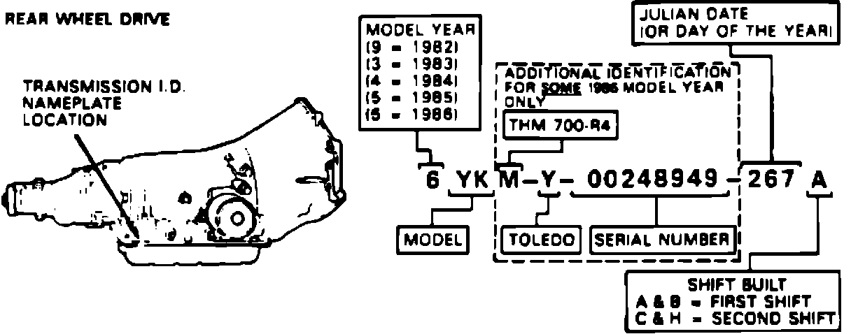 MODEL: Beginning with the start of 1986 production, all THM transmissions will have a 3-letter model designator as opposed to the 2-letter model designator used in previous years. The third letter in each code group will identify the type of transmission as follows: