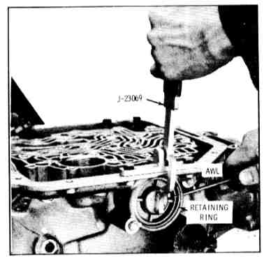 1. Install new seals on accumulator piston and install piston, spring and cover. Compress cover and install retainer ring.