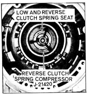 2. Install low and reverse clutch piston. Notch in piston must be installed adjacent to parking pawl. Install piston return springs, and spring seat and, after installing compressor, install snap ring.