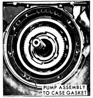 19. Install two guide pins and using slide hammers to hold pump, align and drive pump home. Torque to 15-25 ft lbs. If the input shaft cannot be rotated clockwise as the pump is being bolted into place, the direct clutch and forward clutch housing has not been properly installed to index the face plates with their respective parts. This condition must be corrected before the pump is bolted into place.