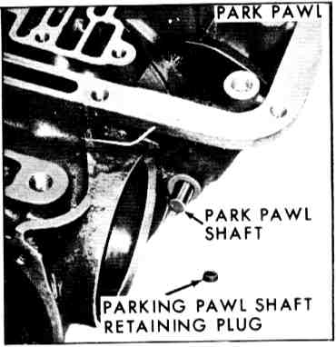 22. Install parking pawl, shaft and plug, Use 3/8 inch diameter rod to seat plug flush and stake plug.