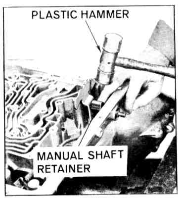 29. Install valve body and gasket, spacer support plate (do not tighten) and spacer plate gasket. Install detent valve link in actuating lever. Install valve body while installing manual link in range selector lever, When handling valve body, do not depress sleeves as retaining pins will fall into transmission.