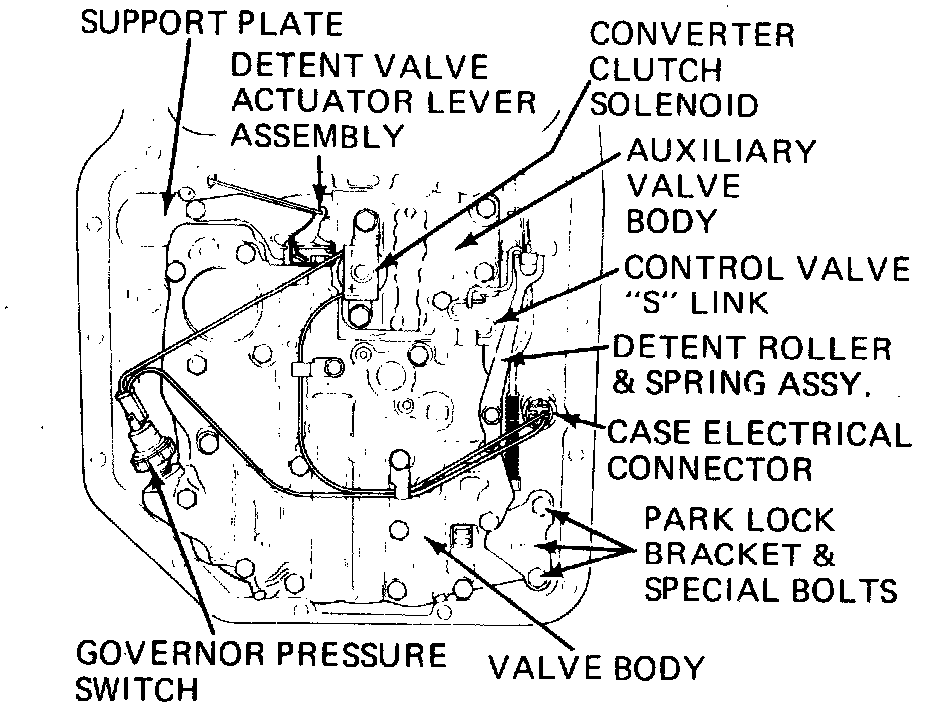 32. Install valve body spacer plate to case gasket, valve body spacer plate and spacer plate to valve body gasket. Install spacer support plate and torque bolts to 13 ft lbs. Install auxiliary valve body and torque bolts to 13 ft lbs. Install valve body and connect manual control valve link to range selector inner lever, then install manual shaft retaining clip and torque bolts to 13 ft lbs, leaving detent roller and spring assembly bolt loose. Do not touch sleeves when handling valve body as retainer pins may fall into transmission. Install detent roller and spring assembly to valve body and install detent control valve wire to detent valve actuating lever, then attach lever to valve body. Install solenoid and connect wires then install governor pressure switch if removed.