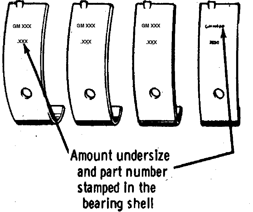 Main bearings are available in standard sizes and undersizes of .0005, .0010 and .0015 inch. The amount of undersize and part number is stamped on the bearing shell, Fig. 36.