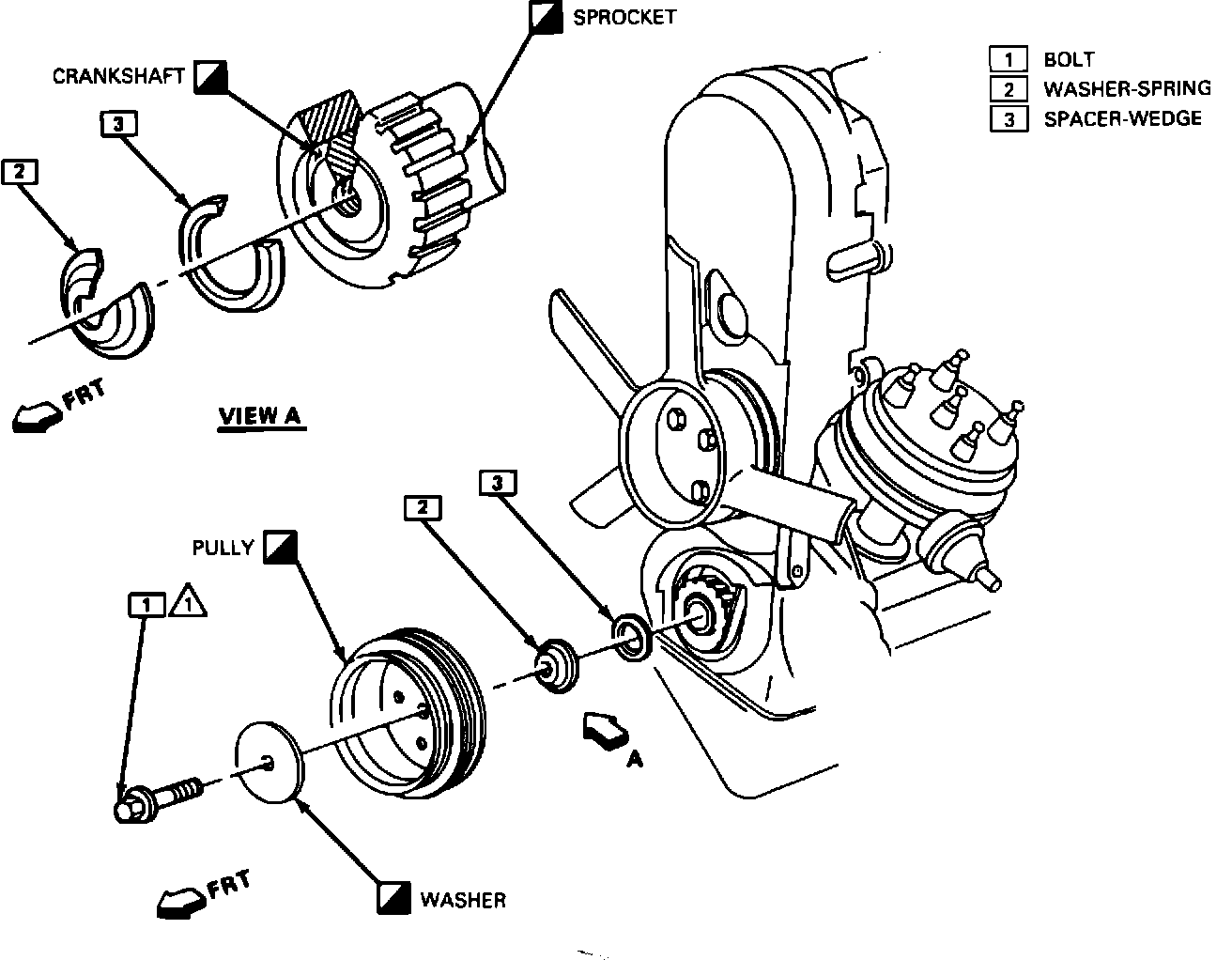 3. Remove crankshaft pulley bolt, washer and pulley.