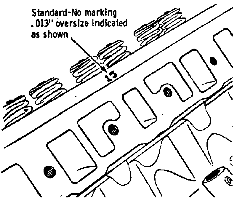 Occasionally a valve guide will be oversize as manufactured. These are marked on the cylinder head as shown in Fig. 24. If no markings are present, the guide bores are standard. If oversize markings are present, any valve replacement will require an oversize valve. Service valves are available in standard diameters as well as .003 inch, .005 inch, .010 inch and .013 inch oversize.