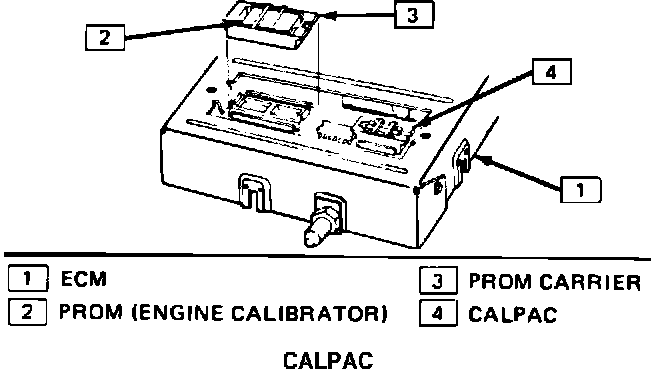 The 1984 Cavalier uses a new type of Electronic Control Module. This ECM uses a PROM and a device called a CALPAC. The purpose of the CALPAC is to allow fuel delivery in the event of PROM or ECM malfunction. The CALPAC has an access door in the ECM, and removal and replacement procedures are the same as with the PROM.