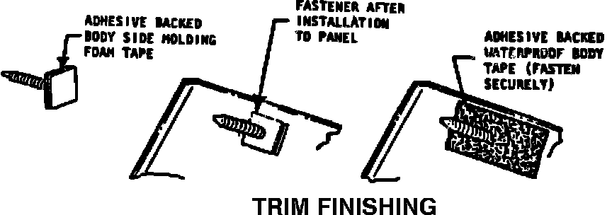 If a loose rear quarter trim finishing panel to fasteners are encountered, the condition may be repaired by installling the fastener to the trim panel using adhesive backed body side molding foam tape (3M-06380 or equivalent) followed by the installation of cloth-backed waterproof body tape as shown in the illustration below. The cloth-backed tape is used to provide adequate retention of fastener to trim panel and prevent peel load on tape.